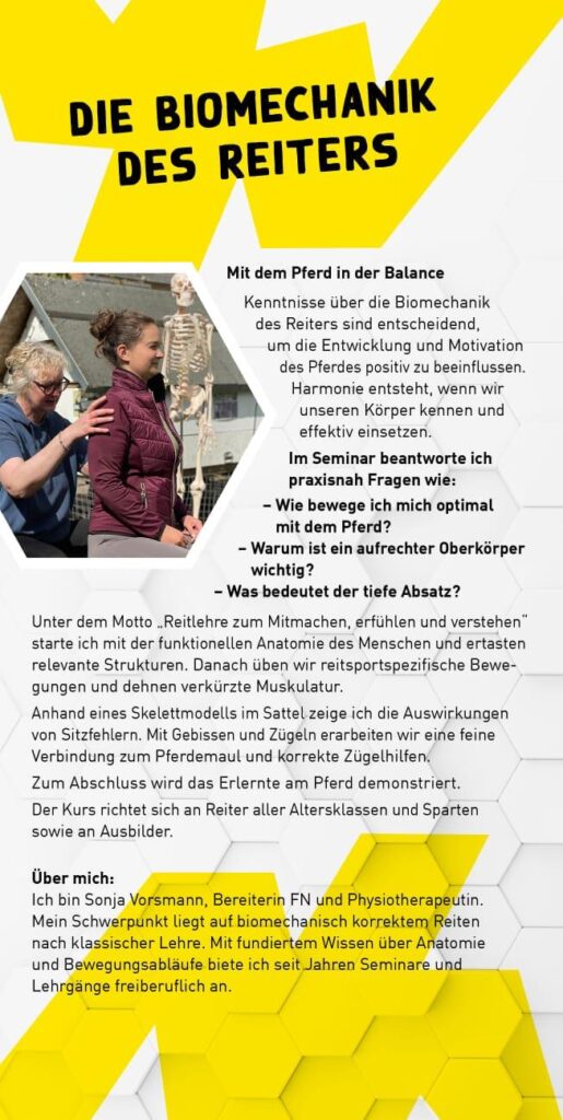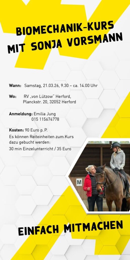 Am Samstag, den 21.03.2026 findet wieder ein Biomechanik-Kurs bei uns auf der Anlage statt. Interessierte melden sich gerne bei Emilia Jung. Alle Infos findet ihr untenstehend.